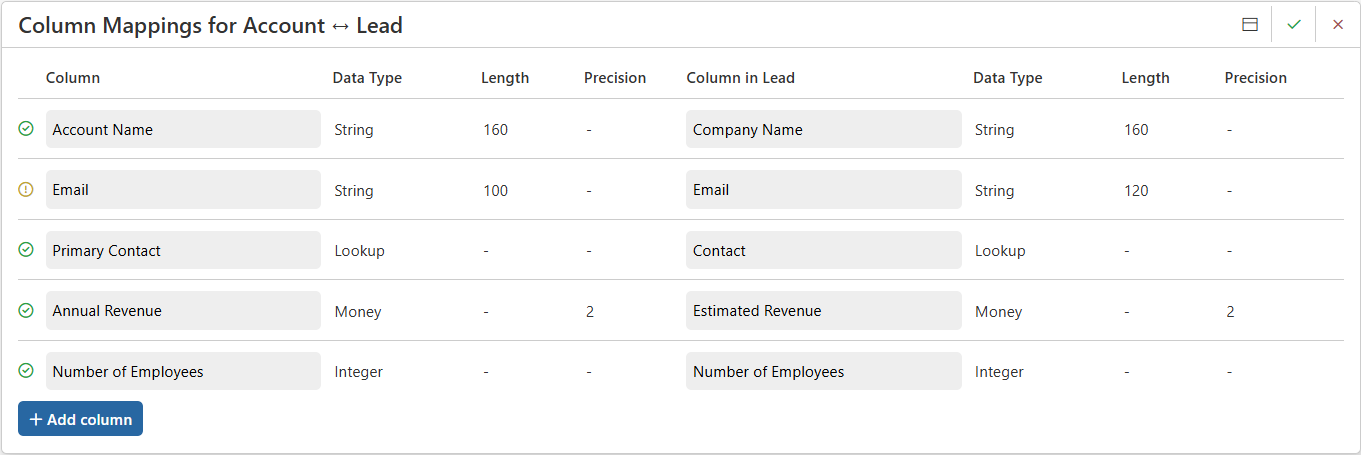 In addition to same-entity merges, Duplicate Manager lets you merge records across entities using flexible Column Mapping configured once — from standard tables like Leads and Accounts to your custom entities, with only minor restrictions.